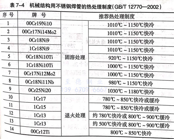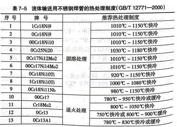 當不(bu)(bu)銹(xiu)鋼(gang)(gang)管(guan)以熱(re)處(chu)理狀態交(jiao)貨(huo)時,必須采用連續式熱(re)處(chu)理爐或周期式熱(re)處(chu)理爐(非連續熱(re)處(chu)理爐)全(quan)長進行熱(re)處(chu)理。由于不(bu)(bu)銹(xiu)鋼(gang)(gang)焊管(guan)分機械(xie)結構用不(bu)(bu)銹(xiu)鋼(gang)(gang)焊管(guan)(GB/T 14976-2002)和流體輸(shu)送用不(bu)(bu)銹(xiu)鋼(gang)(gang)管(guan)(GB/T 14975 -2002),其(qi)熱(re)處(chu)理制(zhi)度(du)不(bu)(bu)完全(quan)相(xiang)同,現將它們分別(bie)列出,見表(biao)7-4和表(biao)7-5.如果采用其(qi)他標(biao)(biao)準生產不(bu)(bu)銹(xiu)鋼(gang)(gang)焊管(guan),其(qi)熱(re)處(chu)理制(zhi)度(du)執行相(xiang)應(ying)的標(biao)(biao)準。