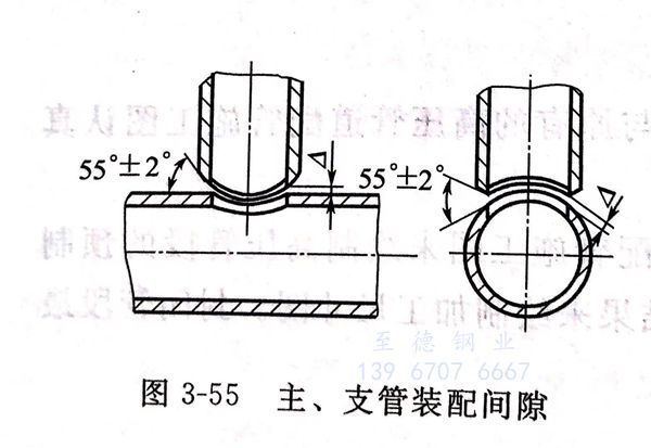 三通的(de)(de)主(zhu)、支(zhi)(zhi)(zhi)(zhi)管(guan)應按(an)圖:3-55所示下(xia)料劃線(xian)(xian),然后(hou)加工支(zhi)(zhi)(zhi)(zhi)管(guan)的(de)(de)“馬鞍(an)形”及圓滑(hua)過(guo)渡的(de)(de)坡口。主(zhu)管(guan)應按(an)支(zhi)(zhi)(zhi)(zhi)管(guan)實際內(nei)(nei)徑用電(dian)鉆開孔(kong)(kong)(kong)(不(bu)能用氣割開孔(kong)(kong)(kong)),孔(kong)(kong)(kong)壁應平整、光滑(hua),孔(kong)(kong)(kong)徑誤差為士(0.2~0.5)mm,孔(kong)(kong)(kong)的(de)(de)中心(xin)(xin)線(xian)(xian)應與(yu)主(zhu)管(guan)中心(xin)(xin)線(xian)(xian)相交(jiao)并(bing)垂直(zhi)。主(zhu)、支(zhi)(zhi)(zhi)(zhi)管(guan)結合處應嚴密(mi)吻合,間隙(xi)均(jun)勻,并(bing)做出定(ding)位標記,以便裝配(pei)。裝配(pei)時支(zhi)(zhi)(zhi)(zhi)管(guan)內(nei)(nei)徑必須對正主(zhu)管(guan)孔(kong)(kong)(kong)口,錯孔(kong)(kong)(kong)量(liang)不(bu)應大于0.5mm.主(zhu)、支(zhi)(zhi)(zhi)(zhi)管(guan)垂直(zhi)度(du)總(zong)偏差量(liang)應小于表3-26的(de)(de)規(gui)定(ding),其(qi)間隙(xi)=1.5~4mm,坡口角度(du)為55°±2°,其(qi)他(ta)部(bu)位坡口角度(du)以圓滑(hua)過(guo)渡為宜,如圖3-55所示,點焊定(ding)位復查后(hou),再正式焊接。