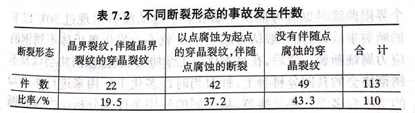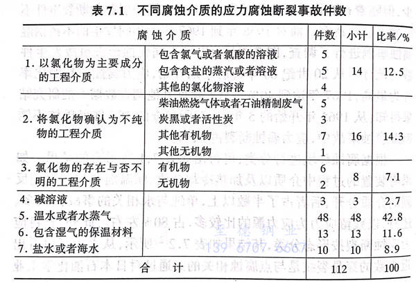根據腐(fu)蝕(shi)環境進行分類,可(ke)得出如果(guo)表7.1所示的(de)(de)結果(guo)。如果(guo)將(jiang)裝置的(de)(de)過程(cheng)中(zhong)介(jie)(jie)質以及(ji)加熱(re)冷卻介(jie)(jie)質、保溫劑等與過程(cheng)相(xiang)反側的(de)(de)介(jie)(jie)質分開,后(hou)者占了半數(shu)以上,單純與水(shui)相(xiang)關的(de)(de)事(shi)故(gu)比(bi)較多。還有,以殘留(liu)應力(li)為(wei)應力(li)源(yuan)的(de)(de)比(bi)較多,占80%左右。此外,若將(jiang)應力(li)腐(fu)蝕(shi)斷(duan)裂(lie)按照(zhao)形態進行劃分,可(ke)以看出近半數(shu)的(de)(de)穿晶(jing)裂(lie)紋是(shi)與點(dian)腐(fu)蝕(shi)相(xiang)關的(de)(de)。通過對日本石油化(hua)學工(gong)業快(kuai)速發展的(de)(de)1955-1975年的(de)(de)20年間石油化(hua)工(gong)廠的(de)(de)腐(fu)蝕(shi)損(sun)傷事(shi)故(gu)的(de)(de)調(diao)查(cha)得知,在所調(diao)查(cha)的(de)(de)306事(shi)故(gu)當中(zhong),42%是(shi)由應力(li)腐(fu)蝕(shi)斷(duan)裂(lie)引起的(de)(de),這(zhe)其(qi)中(zhong)的(de)(de)60%又(you)發生于奧氏體系(xi)不銹(xiu)鋼。
