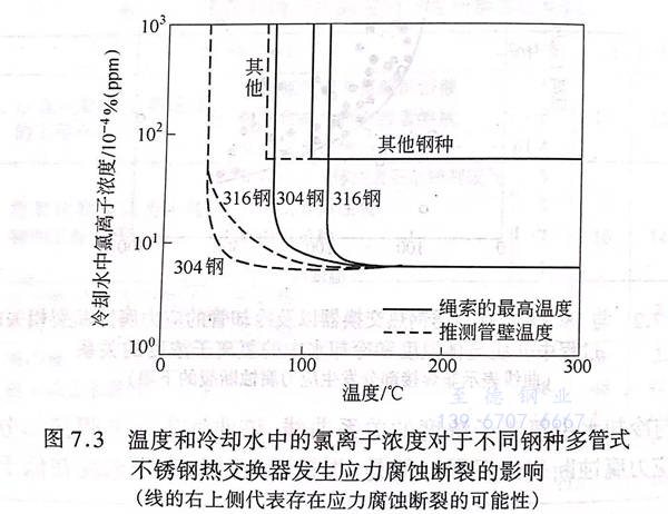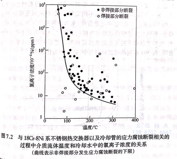 包(bao)含氯(lv)化(hua)物環(huan)境中(zhong)的(de)(de)(de)(de)(de)(de)(de)(de)(de)(de)(de)應(ying)力腐蝕(shi)(shi)(shi)斷(duan)(duan)裂(lie)(lie)對于(yu)各個(ge)化(hua)工廠(chang)(chang)(chang)而言都是(shi)(shi)一個(ge)問題。氯(lv)離子來(lai)自(zi)于(yu)原料或者冷(leng)卻水中(zhong)的(de)(de)(de)(de)(de)(de)(de)(de)(de)(de)(de)不(bu)(bu)純物,其(qi)中(zhong)由后者引起(qi)的(de)(de)(de)(de)(de)(de)(de)(de)(de)(de)(de)應(ying)力腐蝕(shi)(shi)(shi)斷(duan)(duan)裂(lie)(lie)是(shi)(shi)各個(ge)化(hua)工廠(chang)(chang)(chang)的(de)(de)(de)(de)(de)(de)(de)(de)(de)(de)(de)共(gong)(gong)同(tong)問題,為(wei)此(ci)(ci)通(tong)(tong)(tong)過(guo)事(shi)故分(fen)(fen)析可以(yi)明確問題發(fa)(fa)(fa)(fa)生(sheng)(sheng)(sheng)的(de)(de)(de)(de)(de)(de)(de)(de)(de)(de)(de)環(huan)境條(tiao)件(jian)(jian)(jian)。圖7.2是(shi)(shi)西野等(deng)在1970年(nian)發(fa)(fa)(fa)(fa)表(biao)(biao)的(de)(de)(de)(de)(de)(de)(de)(de)(de)(de)(de),該(gai)圖針對實際(ji)裝置(zhi)中(zhong)的(de)(de)(de)(de)(de)(de)(de)(de)(de)(de)(de)18Cr-8Ni系(xi)不(bu)(bu)銹(xiu)鋼(gang)(gang)(gang)熱(re)交(jiao)換器(qi)以(yi)及冷(leng)卻管(guan)的(de)(de)(de)(de)(de)(de)(de)(de)(de)(de)(de)應(ying)力腐蝕(shi)(shi)(shi)斷(duan)(duan)裂(lie)(lie)情(qing)況(kuang),表(biao)(biao)示出了相(xiang)關過(guo)程中(zhong)流(liu)體介質溫(wen)(wen)(wen)度(du)(du)與冷(leng)卻水中(zhong)氯(lv)離子濃(nong)度(du)(du)的(de)(de)(de)(de)(de)(de)(de)(de)(de)(de)(de)關系(xi)曲線,該(gai)曲線表(biao)(biao)示非焊接部分(fen)(fen)發(fa)(fa)(fa)(fa)生(sheng)(sheng)(sheng)應(ying)力腐蝕(shi)(shi)(shi)斷(duan)(duan)裂(lie)(lie)的(de)(de)(de)(de)(de)(de)(de)(de)(de)(de)(de)下限。但(dan)是(shi)(shi),焊接部分(fen)(fen)的(de)(de)(de)(de)(de)(de)(de)(de)(de)(de)(de)氯(lv)離子濃(nong)度(du)(du)在低(di)于(yu)這個(ge)界(jie)限曲線時(shi)也有(you)可能發(fa)(fa)(fa)(fa)生(sheng)(sheng)(sheng)斷(duan)(duan)裂(lie)(lie)。不(bu)(bu)過(guo)從沒有(you)出現過(guo)50℃以(yi)下的(de)(de)(de)(de)(de)(de)(de)(de)(de)(de)(de)斷(duan)(duan)裂(lie)(lie)事(shi)故,因(yin)此(ci)(ci)一般認為(wei)低(di)于(yu)50℃就(jiu)不(bu)(bu)會(hui)(hui)發(fa)(fa)(fa)(fa)生(sheng)(sheng)(sheng)奧氏體不(bu)(bu)銹(xiu)鋼(gang)(gang)(gang)的(de)(de)(de)(de)(de)(de)(de)(de)(de)(de)(de)應(ying)力腐蝕(shi)(shi)(shi)斷(duan)(duan)裂(lie)(lie)。之(zhi)后,在日本化(hua)學工學協(xie)會(hui)(hui)、腐蝕(shi)(shi)(shi)預防協(xie)會(hui)(hui)以(yi)及不(bu)(bu)銹(xiu)鋼(gang)(gang)(gang)協(xie)會(hui)(hui)的(de)(de)(de)(de)(de)(de)(de)(de)(de)(de)(de)共(gong)(gong)同(tong)分(fen)(fen)科會(hui)(hui)上,針對當時(shi)許(xu)多(duo)化(hua)工廠(chang)(chang)(chang)用來(lai)進(jin)行水冷(leng)卻的(de)(de)(de)(de)(de)(de)(de)(de)(de)(de)(de)755臺多(duo)管(guan)式熱(re)交(jiao)換器(qi),從不(bu)(bu)同(tong)的(de)(de)(de)(de)(de)(de)(de)(de)(de)(de)(de)使(shi)用條(tiao)件(jian)(jian)(jian)來(lai)分(fen)(fen)析應(ying)力腐蝕(shi)(shi)(shi)斷(duan)(duan)裂(lie)(lie)的(de)(de)(de)(de)(de)(de)(de)(de)(de)(de)(de)發(fa)(fa)(fa)(fa)生(sheng)(sheng)(sheng)情(qing)況(kuang),并(bing)于(yu)1979年(nian)發(fa)(fa)(fa)(fa)表(biao)(biao)了分(fen)(fen)析結果。圖7.3 表(biao)(biao)示出了繩(sheng)索的(de)(de)(de)(de)(de)(de)(de)(de)(de)(de)(de)最高(gao)(gao)(gao)溫(wen)(wen)(wen)度(du)(du)或推(tui)測(ce)管(guan)壁溫(wen)(wen)(wen)度(du)(du)與冷(leng)水中(zhong)的(de)(de)(de)(de)(de)(de)(de)(de)(de)(de)(de)氯(lv)離子濃(nong)度(du)(du)的(de)(de)(de)(de)(de)(de)(de)(de)(de)(de)(de)關系(xi),并(bing)表(biao)(biao)明了不(bu)(bu)同(tong)材(cai)質的(de)(de)(de)(de)(de)(de)(de)(de)(de)(de)(de)斷(duan)(duan)裂(lie)(lie)發(fa)(fa)(fa)(fa)生(sheng)(sheng)(sheng)界(jie)限。可以(yi)看出,發(fa)(fa)(fa)(fa)生(sheng)(sheng)(sheng)應(ying)力腐蝕(shi)(shi)(shi)斷(duan)(duan)裂(lie)(lie)的(de)(de)(de)(de)(de)(de)(de)(de)(de)(de)(de)繩(sheng)索最高(gao)(gao)(gao)溫(wen)(wen)(wen)度(du)(du)下限為(wei):304系(xi)鋼(gang)(gang)(gang)約(yue)80℃;316系(xi)鋼(gang)(gang)(gang)還要(yao)高(gao)(gao)(gao),約(yue)達110℃.此(ci)(ci)外(wai)由于(yu)數據比(bi)較少,沒有(you)出現鐵素(su)體系(xi)、雙相(xiang)系(xi)的(de)(de)(de)(de)(de)(de)(de)(de)(de)(de)(de)斷(duan)(duan)裂(lie)(lie)實例。不(bu)(bu)過(guo)如(ru)果不(bu)(bu)采(cai)用最高(gao)(gao)(gao)使(shi)用溫(wen)(wen)(wen)度(du)(du)而采(cai)用推(tui)測(ce)管(guan)壁溫(wen)(wen)(wen)度(du)(du),界(jie)限溫(wen)(wen)(wen)度(du)(du)就(jiu)要(yao)比(bi)50℃低(di)得多(duo),304系(xi)鋼(gang)(gang)(gang)和316系(xi)鋼(gang)(gang)(gang)的(de)(de)(de)(de)(de)(de)(de)(de)(de)(de)(de)差別也就(jiu)消失了。另(ling)一方面,從熱(re)交(jiao)換器(qi)的(de)(de)(de)(de)(de)(de)(de)(de)(de)(de)(de)不(bu)(bu)同(tong)安(an)置(zhi)方式(縱(zong)向或是(shi)(shi)橫(heng)向)以(yi)及水的(de)(de)(de)(de)(de)(de)(de)(de)(de)(de)(de)不(bu)(bu)同(tong)流(liu)通(tong)(tong)(tong)方式(管(guan)內或是(shi)(shi)管(guan)外(wai))來(lai)考慮斷(duan)(duan)裂(lie)(lie)發(fa)(fa)(fa)(fa)生(sheng)(sheng)(sheng)的(de)(de)(de)(de)(de)(de)(de)(de)(de)(de)(de)條(tiao)件(jian)(jian)(jian),可以(yi)得出:若熱(re)交(jiao)換器(qi)管(guan)內通(tong)(tong)(tong)涼水并(bing)橫(heng)向安(an)置(zhi)時(shi),無斷(duan)(duan)裂(lie)(lie)的(de)(de)(de)(de)(de)(de)(de)(de)(de)(de)(de)條(tiao)件(jian)(jian)(jian)范圍擴(kuo)大(da)、氣相(xiang)等(deng)氯(lv)離子的(de)(de)(de)(de)(de)(de)(de)(de)(de)(de)(de)無濃(nong)縮條(tiao)件(jian)(jian)(jian)良(liang)好等(deng)。之(zhi)后的(de)(de)(de)(de)(de)(de)(de)(de)(de)(de)(de)調查結果進(jin)一步表(biao)(biao)明:在304系(xi)鋼(gang)(gang)(gang)的(de)