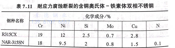 此(ci)(ci)后,隨著熱水器的(de)發展,與鐵素(su)體(ti)不銹鋼(gang)相比,人們更加(jia)希(xi)望使用焊接性(xing)和加(jia)工(gong)性(xing)能好的(de)奧(ao)氏(shi)(shi)體(ti)不銹鋼(gang),只要它不會(hui)出(chu)現應力腐蝕斷裂。因此(ci)(ci),通過對上(shang)述低濃度(du)食鹽水試驗結果的(de)研究,最近研究者們正在研制含有銅和硅等元素(su)的(de)新型奧(ao)氏(shi)(shi)體(ti)不銹鋼(gang)。在1999年(nian)這些新鋼(gang)種被(bei)JIS所采用,并統稱為SUS315SN.其名(ming)稱和主要成分如表7.11所示。
