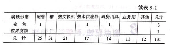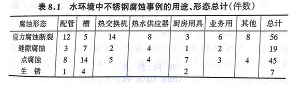 鈍化膜的存在使不銹鋼維持其耐蝕性。在不銹鋼表面產生的局部集中腐蝕,最后形成孔狀的現象叫做點腐蝕,Uhlig(1940年)認為點腐蝕是導致鈍態破壞的原因。此外,在金屬/金屬之間、金屬/非金屬之間或附著物下出現縫隙時,縫隙的一部分或全部被腐蝕的現象叫縫隙腐(fu)蝕。在有機酸環境下也會出現這些腐蝕現象,在實際應用中,很多問題出現在以海水為代表的含有少量氯離子的環境中。正如第7章中圖7.1所示,在化學工廠中的腐蝕事例中,點腐蝕和縫隙腐蝕事例是繼應力腐蝕斷裂之后出現最頻繁的問題,特別是近幾年來不銹鋼的用途在水處理領域中不斷擴大,因此成為一個非常重要的問題。金子等人在1990年對處于水環境中的不銹鋼腐蝕事例進行了分析,表8.1是從其分析結果中摘錄的按用途和形態所作出的總計結果。根據表8.1,點腐蝕和縫隙腐蝕占總數的49%,此外如果把大氣中的生銹也看作從小孔開始,然后逐漸擴散,那么也可以把它看作為點腐蝕、縫隙腐蝕等局部腐蝕的一種,所以再加上大氣中的腐蝕,那54%的腐蝕都屬于這種腐蝕形態,它與應力腐蝕斷裂一起成為不銹鋼所面臨的重大問題。