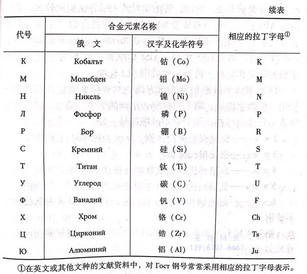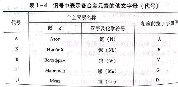 (2) 合金元素符號(hao)。用俄文(wen)字母作為合金元素的代號(hao)。表示各主要合金元素的俄文(wen)母見表1-4.