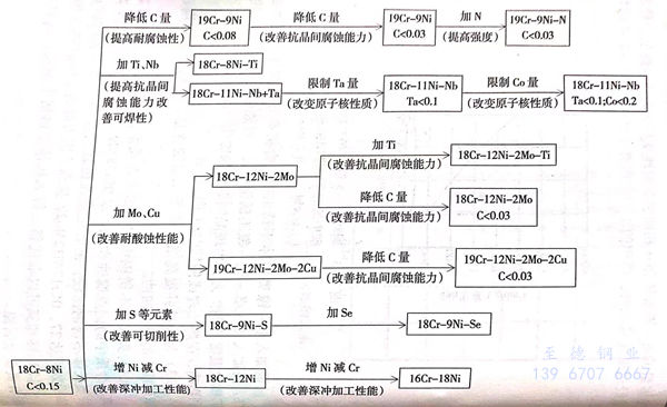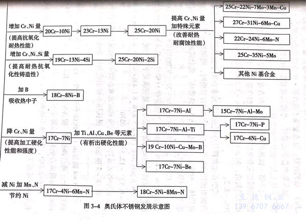式中(zhong)各元素符號(hao)分(fen)別表示該元素在鋼中(zhong)的質(zhi)量(liang)百分(fen)數(shu)含(han)量(liang)。在18-8鋼基(ji)礎上,奧氏(shi)體(ti)不銹鋼的發展變化過程見圖(tu)3-4。