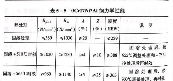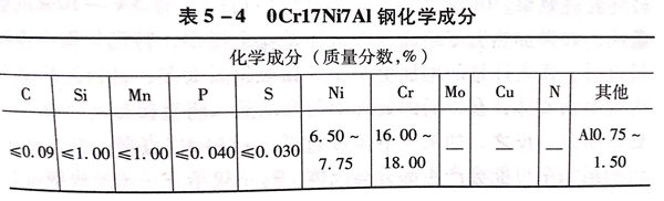 0Cr17Ni7AI(PH17-7)是半奧(ao)氏體沉淀硬化不(bu)銹鋼的(de)典(dian)型牌(pai)號,其化學(xue)(xue)成分見表(biao)5-4,標準規(gui)定的(de)力學(xue)(xue)性能(neng)見表(biao)5-5。