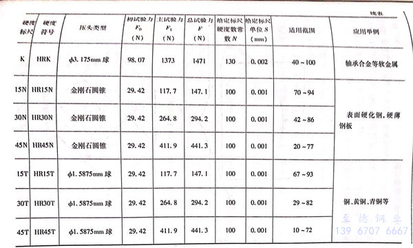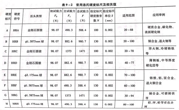 洛氏硬度壓頭、初始試驗力F0、主試驗力F1、計算常數N和S都依據洛氏硬度標尺的不同而不同。見表9-2。