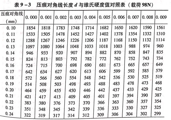 表9-3是試驗力(li)為98N測得的(de)(de)壓痕對角(jiao)線長度(du)對應的(de)(de)維氏硬度(du)值,不同試驗力(li),應查對應試驗力(li)的(de)(de)表。