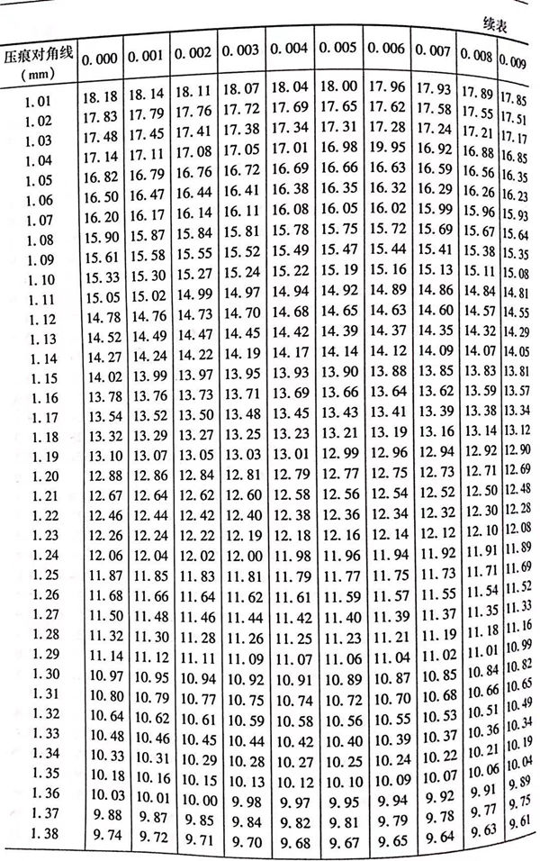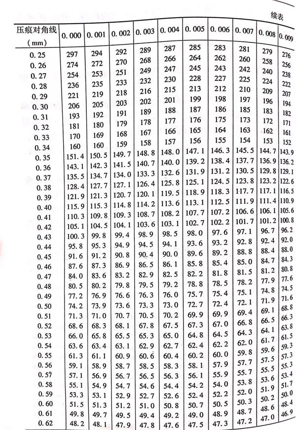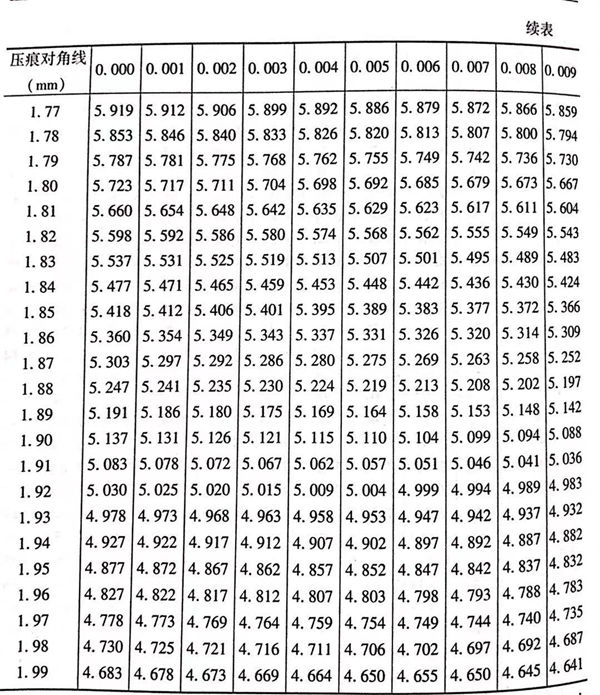 1. 將(jiang)實測壓痕對角線長度值的(de)小數點移動一位(wei),變成表(biao)中含有的(de)數值。
