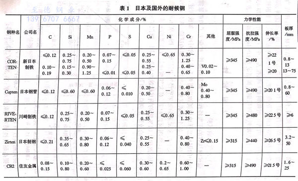 再者,雖然是(shi)耐(nai)候(hou)鋼(gang),但(dan)是(shi)作(zuo)為(wei)近代的結構材料,其理(li)所當然在強度、韌(ren)性(xing)(xing)、焊接(jie)(jie)性(xing)(xing)、加工性(xing)(xing)、涂漆性(xing)(xing)等性(xing)(xing)能上也(ye)必(bi)須優(you)秀,而且并不意味著價格比碳素鋼(gang)高。把這些問題考慮(lv)在內,日本鋼(gang)鐵公司開(kai)發的正(zheng)在銷售的耐(nai)候(hou)鋼(gang)被(bei)歸(gui)納在表1中,1968年(nian)(昭和43年(nian)4月1日)作(zuo)為(wei)耐(nai)候(hou)性(xing)(xing)焊接(jie)(jie)鋼(gang)已被(bei)制(zhi)定為(wei)JIS標準(zhun),被(bei)列在表2中。