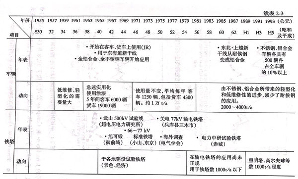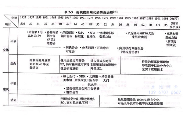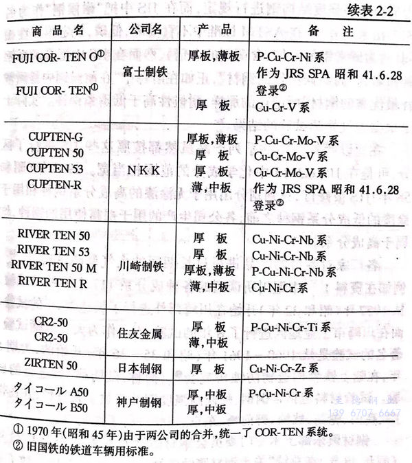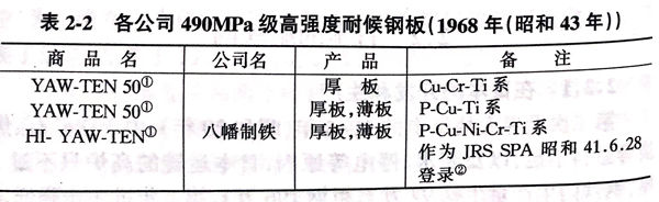 詳情請參照卷末的(de)(de)(de)資料1,最初(chu)銷(xiao)售的(de)(de)(de)鋼(gang)(gang)(gang)種(zhong)(zhong)在1957年(nian)(昭和(he)(he)(he)32年(nian))是銅系(xi)(xi)的(de)(de)(de)Cuplon鋼(gang)(gang)(gang),1960年(nian)(昭和(he)(he)(he)35年(nian))是YAW-TEN鋼(gang)(gang)(gang)(Cu-P-Ti系(xi)(xi))、FUJI COR-TEN鋼(gang)(gang)(gang),1961年(nian)開始生產銷(xiao)售Cupten鋼(gang)(gang)(gang)(Cu-P-Cr系(xi)(xi))。以后(hou),其(qi)他廠(chang)家的(de)(de)(de)商品(pin)也開始銷(xiao)售,通過車(che)輛及一(yi)般(ban)結構用(yong)(yong)(高磷)和(he)(he)(he)焊(han)接結構用(yong)(yong)(低磷)的(de)(de)(de)劃(hua)分,按(an)用(yong)(yong)途不(bu)同的(de)(de)(de)品(pin)種(zhong)(zhong)劃(hua)分,以及焊(han)接結構用(yong)(yong)按(an)抗拉強(qiang)度不(bu)同的(de)(de)(de)品(pin)種(zhong)(zhong)劃(hua)分等,實現了(le)多(duo)品(pin)種(zhong)(zhong)化。到(dao)20世紀60~70年(nian)代(昭和(he)(he)(he)40年(nian)代初(chu)期(qi)),大(da)致的(de)(de)(de)品(pin)種(zhong)(zhong)已(yi)經齊全,1968年(nian)(昭和(he)(he)(he)43年(nian))時的(de)(de)(de)490MPa(50kg/m㎡)級的(de)(de)(de)高強(qiang)度耐候(hou)鋼(gang)(gang)(gang)的(de)(de)(de)典型產品(pin)示于表2-2。