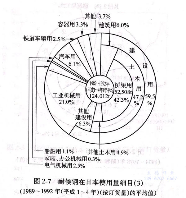 下一節(jie)以(yi)后將按用(yong)(yong)途使用(yong)(yong)的(de)動向敘述。在(zai)表2-3中,以年(nian)(nian)(nian)(nian)表示(shi)(shi)出了(le)耐候(hou)鋼(gang)(gang)40年(nian)(nian)(nian)(nian)間的(de)動向。并且(qie)在(zai)圖2-3及(ji)圖2-4上示(shi)(shi)出了(le)日(ri)本鋼(gang)(gang)材使用量的(de)變化。圖2-5~圖2-7是以圓形圖表示(shi)(shi)的(de)1974~1978年(nian)(nian)(nian)(nian)(昭(zhao)和49~昭(zhao)和53年(nian)(nian)(nian)(nian))、1985年(nian)(nian)(nian)(nian)(昭(zhao)和60年(nian)(nian)(nian)(nian))以及(ji)1989~1992年(nian)(nian)(nian)(nian)(平(ping)成(cheng)元年(nian)(nian)(nian)(nian)~平(ping)成(cheng)4年(nian)(nian)(nian)(nian))的(de)用途比率。