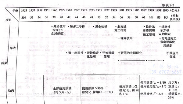 每(mei)座橋梁(liang)的(de)(de)使用(yong)鋼(gang)材量(liang)(liang)比較大,經(jing)常保(bao)持在按用(yong)途使用(yong)量(liang)(liang)的(de)(de)首位。20世(shi)紀70~80年(nian)(nian)代(昭和50年(nian)(nian)代)后期(qi)幾乎(hu)都是涂漆使用(yong)。然(ran)而(er)以后由于補修涂漆、再涂漆在橋梁(liang)整體上出(chu)現了(le)費用(yong)問題,并且隨(sui)著技術的(de)(de)進步、腐蝕(shi)環境的(de)(de)改善等,逐漸(jian)地使無涂漆使用(yong)成為了(le)中心。