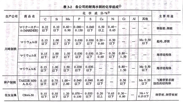 這些鋼(gang)(gang)種的開(kai)發,到(dao)1970年(nian)(nian)代初期(昭和46~47年(nian)(nian))基本(ben)結(jie)束,各(ge)公司(si)開(kai)始生產銷售(shou)。表(biao)3-2示出(chu)了日本(ben)現在(zai)正在(zai)生產的耐(nai)海(hai)水鋼(gang)(gang)。1973年(nian)(nian)出(chu)版(ban)的鋼(gang)(gang)材俱樂部的“關(guan)于鋼(gang)(gang)材的腐(fu)蝕(shi)防蝕(shi)的資料”中,用表(biao)給出(chu)的“日本(ben)國內各(ge)鋼(gang)(gang)鐵公司(si)的耐(nai)海(hai)水鋼(gang)(gang)的規格”常常被引用,表(biao)3-2是以(yi)此(ci)為(wei)基礎參考文獻追加(jia)了以(yi)后的鋼(gang)(gang)種制成(cheng)的。與耐(nai)候鋼(gang)(gang)不同成(cheng)分系相當多,還(huan)沒(mei)有成(cheng)為(wei)JIS標(biao)準(zhun)。