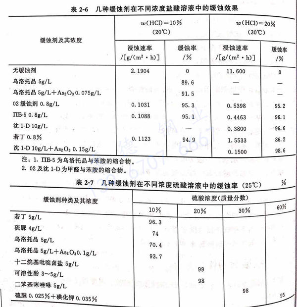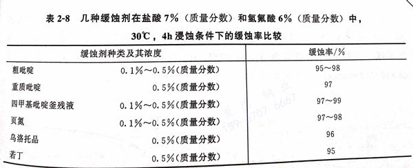 幾(ji)種緩(huan)蝕(shi)劑在不同(tong)濃度的(de)鹽酸(suan)(suan)溶液中的(de)緩(huan)蝕(shi)效果(guo)見(jian)(jian)表2-6, 幾(ji)種緩(huan)蝕(shi)劑在不同(tong)濃度的(de)硫酸(suan)(suan)溶液中的(de)緩(huan)蝕(shi)率見(jian)(jian)表2-7, 幾(ji)種緩(huan)蝕(shi)劑在鹽酸(suan)(suan)與氫(qing)氟酸(suan)(suan)混合酸(suan)(suan)中的(de)緩(huan)蝕(shi)率見(jian)(jian)表2-8。