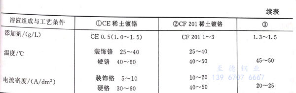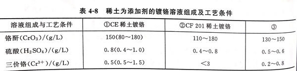a. 采用稀土為添加劑的鍍(du)鉻,可獲得較均勻的鉻層,使用較低的鉻酐和電(dian)流密度,其溶液組成和工藝條件見表 4-8 。