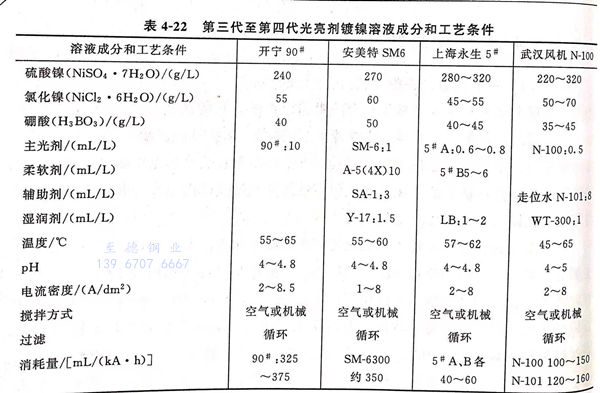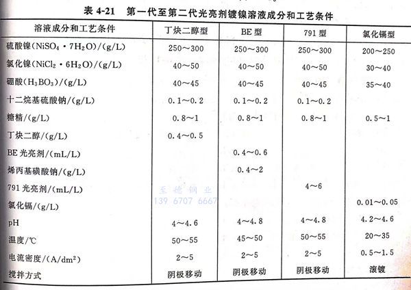 光亮鍍鎳溶液成(cheng)分及(ji)工藝條(tiao)件見(jian)表4-21、表4-22。