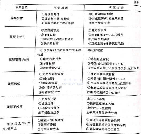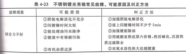 不銹鋼鍍光亮(liang)鎳常見(jian)故障、可能原(yuan)因及糾正方法見(jian)表4-23.