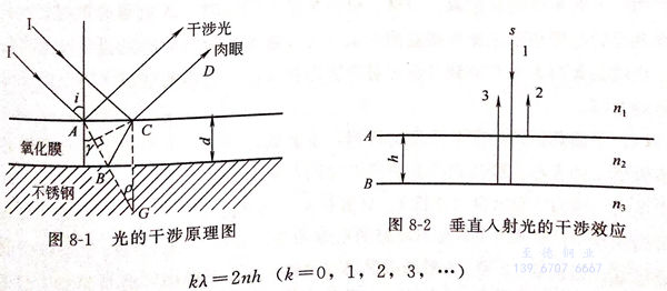 不(bu)銹鋼(gang)在酸性化學著色液中經過表面氧化著色處理后,顯示出各種色彩,并非形成有色的表面覆蓋層。1977年伊文斯最早提出,表面形成的無色氧化膜的色彩是由于光的干涉所致的。光的干涉原理圖見圖8-1。入射光I從空氣中以入射角i角度照射到氧化膜表面A點,一部分光反射回空氣中成為反射光;另一部分光以人射角γ角度成為折射光在氧化膜中沿AB方向傳播至不銹鋼上B點,當遇上不銹鋼基體表面后,就發生全反射,成為反射光,沿BC方向傳播至C點。在氧化膜C點,一部分經折射后進入空氣中成為CD光;另一部分在氧化膜內反射到不銹鋼基體上。這時折射光CD與A點的反射光由于存在位相差和光程差,當這兩束光相遇就會發生光的干涉現象,出現不同的干涉色彩。如果從垂直方向觀察彩色膜時,入射角為0°,即光束1垂直人射到氧化膜上,見圖8-2所示,其中h為氧化膜厚度,n為氧化膜的折射率,光束2為光束1的反射光,光束3為光束1氧化膜折射后的折射光。反射光2和折射光3為兩相干涉光,總光程差為Δ=2nh.當膜層中光程差為該光束光波波長入的正整數的k倍,即
