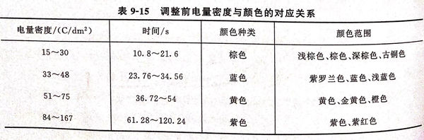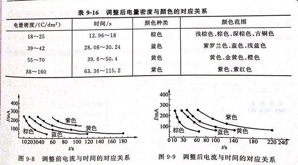 見圖9-7,由圖可(ke)見,每一(yi)(yi)種顏色(se)的電(dian)流與時間大(da)致呈反(fan)比例關系。實驗發現(xian),每一(yi)(yi)個試樣上,只要達(da)到一(yi)(yi)定的電(dian)量(liang)(liang)密度,就會(hui)出現(xian)不(bu)同的顏色(se),就可(ke)采用控(kong)制(zhi)電(dian)量(liang)(liang)來達(da)到不(bu)銹鋼著色(se)的目的。