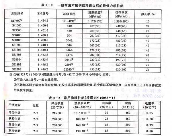 不銹(xiu)鋼退火后(hou)的最低力學性(xing)能(neng)及常用(yong)物(wu)理(li)性(xing)能(neng)如下: