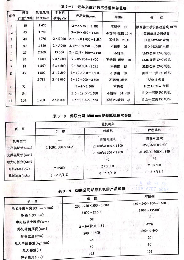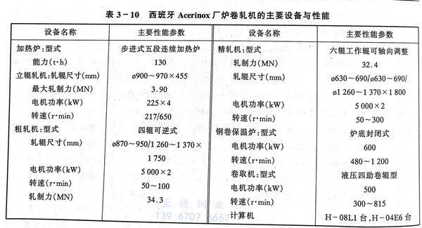 在鋼鐵聯合企業中熱軋不(bu)銹鋼(gang)帶(dai)都采用已有的連續式熱軋帶鋼軋機生產。傳統的連續式熱軋帶鋼軋機經歷了三個階段(見表3-6).其生產能力、產品質量、自動化水平均有很大提高。對于不銹鋼生產,由于其熱軋變形抗力比低碳鋼高2~3倍(除鐵素體不銹鋼外),因此軋制不銹鋼時,要將坯料進入精軋機的溫度提高到1100℃.有些廠為此目的已將連續式或3/4軋機改造成半連續式軋機。改造后粗軋機主傳動電機容量達2×5000kW以上,軋速達到5m/s以上,負荷達到4000t以上。為了實現寬度控制,在粗軋機采用液壓傳動的立輥軋機,并設有預置FF-AWC和FB-AWC寬度自動控制裝置。為了實現長度方向的厚度控制,精軋機組全部采用高應答(0.05秒,周波數應答35Hz)交流馬達和高速液壓下厚度自動控制AGC.對于帶鋼斷面厚度和板形的控制,廣泛采用了HCW、CVC和PC軋機。
