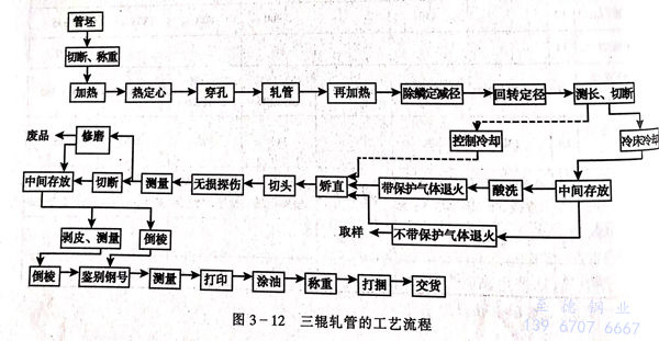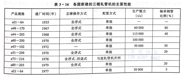 三輥軋管工藝是把穿孔后的荒管在三個呈120°配置的軋輥和一根長芯棒之間進行旋轉前進碾軋的,所以可以生產尺寸精度高、表面質量好的產品。而且三輥軋管機具有便于調整、容易變換規格、靈活性高等特點。適合小批量多品種的不銹鋼管生產。主要用于生產厚壁鋼管。產品的外徑與壁厚比可在4~18的范圍。生產工藝過程包括管坯準備、加熱、定心、穿孔軋管、再加熱、定減徑、回轉定徑、冷卻和矯直、切頭和探傷等工序。生產工藝流程見圖3-12,三輥軋管機在生產D/S=15~4.5的鋼管時采用全浮動式芯棒,在生產D/S=4.5~3.的厚壁管時采用回退式芯棒。三輥軋管機一般都配置5~14架定徑機(或減徑機、張力減徑機)和二輥式回轉定徑機。各國新建的三輥軋管機的主要性能見表3-16。