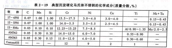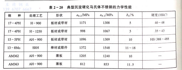 沉淀硬化馬(ma)氏(shi)體不銹鋼的化學成分如表2-19所示。這類鋼在高溫下是奧氏體組織,因其Ms點高,Mf點亦在室溫以上。以17-4PH鋼為例。經過1020~1060℃固溶處理后,形成馬氏體組織,再經時效處理(470~630℃),在馬氏體組織中固溶度小的Cu、Nb、Mo、Al、Ti等發生碳化物析出和強化作用,其屈服強度可達到1171MPa(見表2-20)。