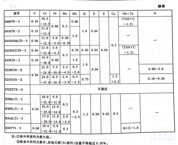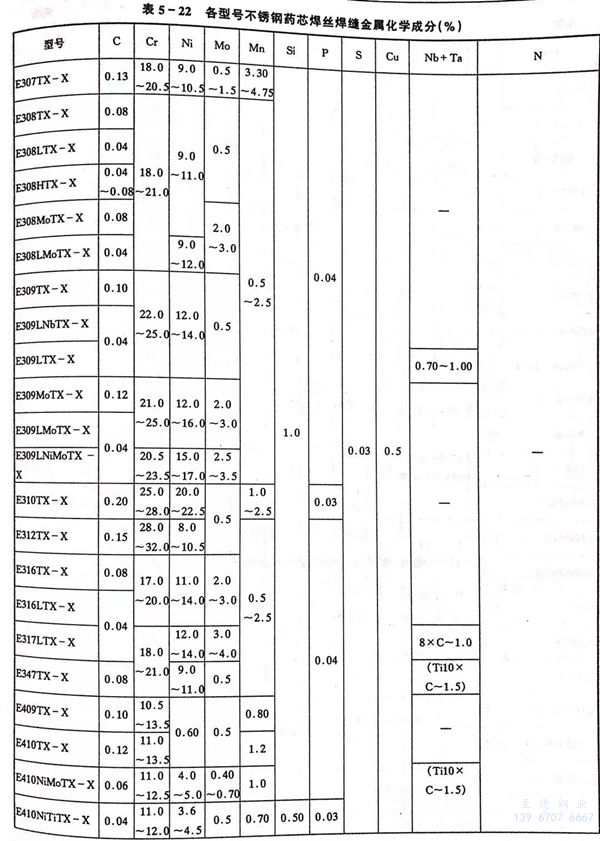 GB/T 17853-1999 根據熔(rong)敷金屬化(hua)學成分(fen)劃分(fen)的不銹鋼藥芯(xin)焊絲型號見表5-22。