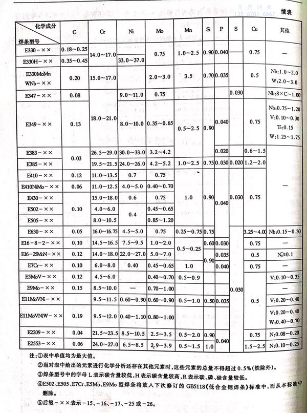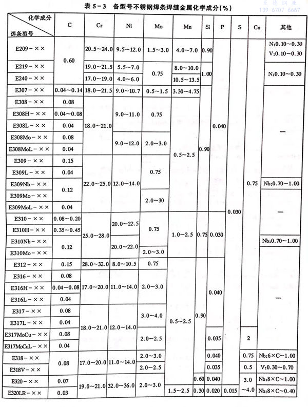 國家標準GB/T 983-1995中規定(ding)了不銹(xiu)鋼焊條的(de)型號分類、技術要求(qiu)、試驗方(fang)法及檢(jian)驗規則等(deng)。該標準規定(ding),所(suo)適用的(de)不銹(xiu)鋼焊條熔敷金(jin)屬(shu)中鉻含(han)量(liang)應(ying)大(da)于10.50%,鐵的(de)含(han)量(liang)應(ying)超(chao)過(guo)其他任何元素(見表(biao)5-1,表(biao)5-2).