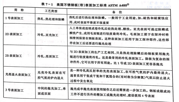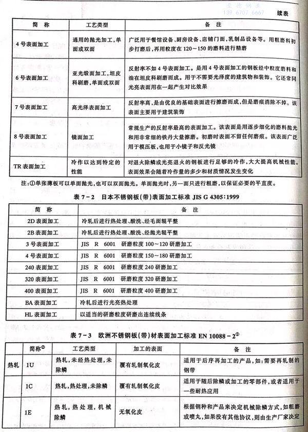 表7-1至表7-3顯(xian)示出了(le)有關標準(zhun)中(zhong)的許(xu)多種板材的表面(mian)加(jia)工(gong)。其中(zhong)大量應用的是(shi)2B或2R(有時稱為(wei)BA或2BA)和4號表面(mian)加(jia)工(gong)。