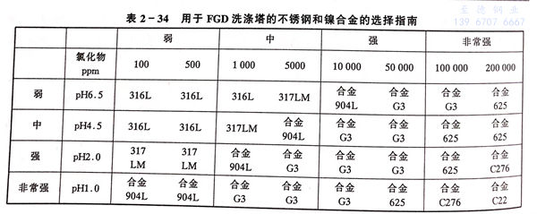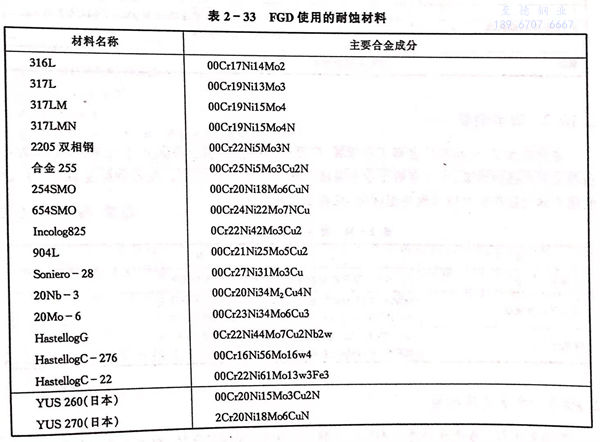 在煙氣脫硫裝置中所使用的耐蝕材料涉及到一般不(bu)銹鋼、高性能不銹鋼以及鎳基耐蝕合金(jin),見表2-33.可根據介質條件進行合理選擇。通常按表2-34所列原則選擇煙氣脫硫不同裝置的耐蝕材料。