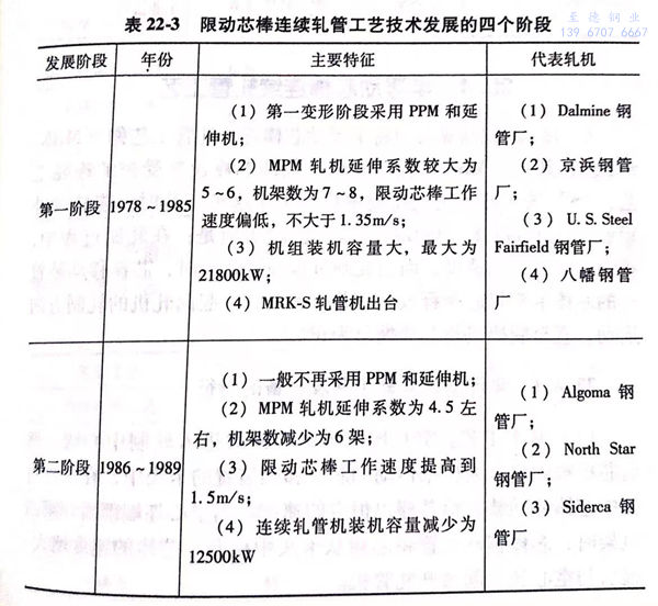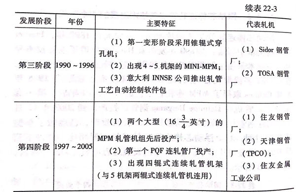 不銹(xiu)鋼管(guan)(guan)(guan)限動芯棒連(lian)軋(ya)管(guan)(guan)(guan)工藝的(de)技(ji)術(shu)發展史應溯自1890年(nian),Pfeiffer在一篇(pian)文(wen)章中寫道:“1890年(nian)發明家(jia)Heckert 申請(qing)了(le)(le)連(lian)軋(ya)技(ji)術(shu)專(zhuan)利,該技(ji)術(shu)采用十(shi)架(jia)兩輥高速軋(ya)機(ji)(ji)(ji)固定芯棒軋(ya)制空心管(guan)(guan)(guan)坯。可見在Calmes 多機(ji)(ji)(ji)架(jia)軋(ya)管(guan)(guan)(guan)機(ji)(ji)(ji)問(wen)世前80年(nian),就已有了(le)(le)雛形。”1968年(nian)A.H.Calmes 取得了(le)(le)MPM連(lian)軋(ya)管(guan)(guan)(guan)工藝的(de)權利,10年(nian)后(hou),第一套MPM連(lian)軋(ya)管(guan)(guan)(guan)機(ji)(ji)(ji)在Dalmine Bergamo 鋼管(guan)(guan)(guan)廠(chang)投產,到2003年(nian)12月天(tian)津無縫(feng)不銹(xiu)鋼管(guan)(guan)(guan)廠(chang)三輥式限動芯棒連(lian)軋(ya)管(guan)(guan)(guan)機(ji)(ji)(ji)投產,已經(jing)歷了(le)(le)整(zheng)整(zheng)25年(nian)的(de)時間,和全浮動芯棒連(lian)軋(ya)管(guan)(guan)(guan)技(ji)術(shu)的(de)發展相(xiang)比,這(zhe)種工藝技(ji)術(shu)的(de)發展顯得快多了(le)(le)。這(zhe)25年(nian)的(de)發展歷程可劃分為四個階段,如表22-3所示(shi)。
