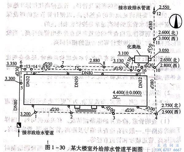③. 了解給排水管道的埋深及管徑。管道標高往往標注絕對標高,識讀時要搞清楚地面的自然標高,以便計算管道的埋設深度。室外給排水管道的標高通常是按管底來標注的。