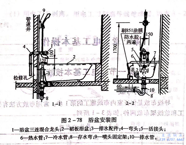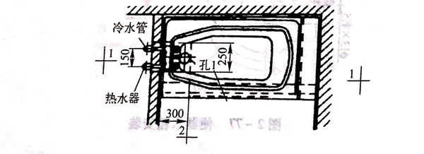 淋浴器噴管與成套產品采用鎖母(mu)連接(jie)(jie)(jie),并加墊橡膠圈;與現(xian)場組裝(zhuang)彎管連接(jie)(jie)(jie)一般為焊接(jie)(jie)(jie)。淋浴器噴頭(tou)距(ju)地面不低于2.1m.浴盆安裝(zhuang)圖如圖2-78所示(shi)。