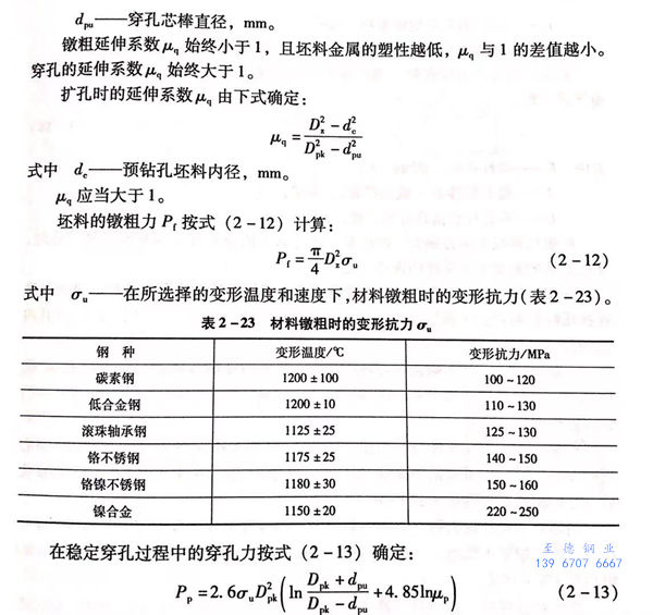 對于碳素鋼和(he)合金鋼,坯料和(he)穿孔(kong)筒內襯直徑之差6~15mm;