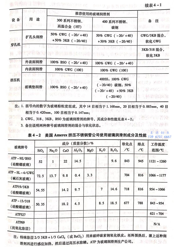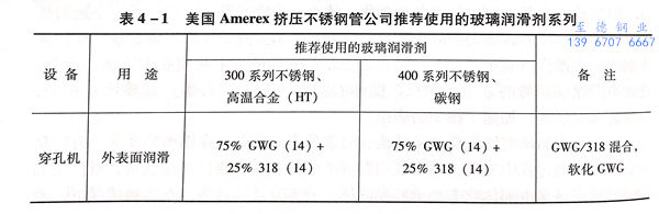 表(biao)4-1 為美國(guo)(guo) Amerex 擠壓不銹鋼(gang)管公司推(tui)薦(jian)使(shi)用(yong)(yong)的玻璃潤滑劑(ji)系列,表(biao) 4-2 為美國(guo)(guo) Amerex 公司使(shi)用(yong)(yong)玻璃潤滑劑(ji)成(cheng)分及性能。