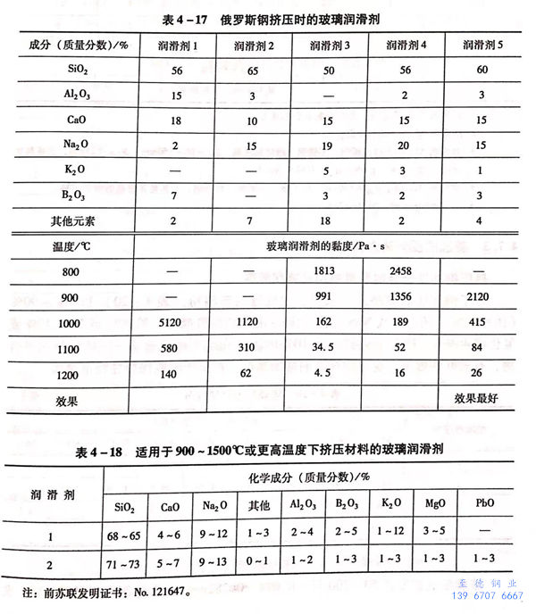 俄羅斯擠壓不銹鋼管和型材時推薦使用以下玻璃潤滑劑,見表4-17~表4-19.