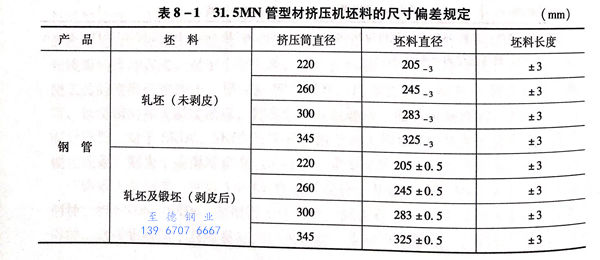 軋坯(pi)(pi)及鍛坯(pi)(pi)未剝(bo)皮(pi)和經剝(bo)皮(pi)后偏差(cha)均為(wei)±3.0mm。31.5MN(3150t)擠(ji)壓機用于(yu)管材、棒(bang)材及型材生產時對其坯(pi)(pi)料尺寸偏差(cha)的規定(ding)見表8-1.