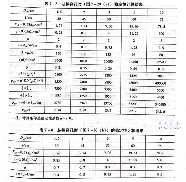 表 7-3 和表 7-4 是對以下尺寸的不銹鋼管穿孔芯棒進行縱向彎曲校核的結果:直徑Dur 分別為 1.5cm、2.0cm、3.0cm、5.0cm、10.0cm,長度 l 分別為 30.0cm、45.0cm、50.0cm、60.0cm、75.0cm。
