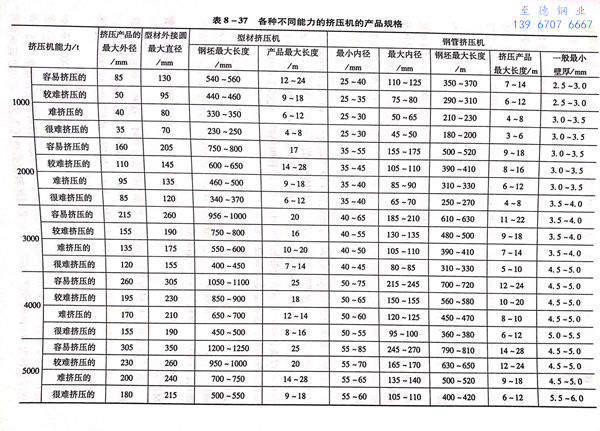 表8-35為擠(ji)壓(ya)(ya)機(ji)擠(ji)壓(ya)(ya)材料的種類(lei),表8-36為各種不同噸(dun)位(wei)擠(ji)壓(ya)(ya)機(ji)的年產(chan)量(估(gu)計),表8-37為各種不同能力擠(ji)壓(ya)(ya)機(ji)的產(chan)品規格。