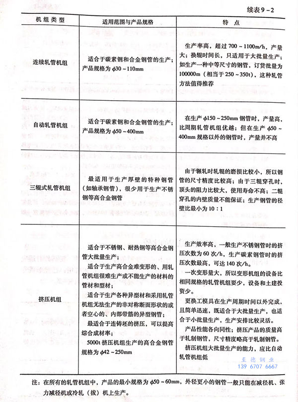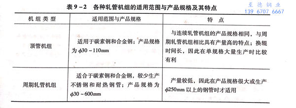 不同的軋制不銹鋼管方法在軋制時所具有不同的變形條件和工藝條件,使其具有適應于不同材料產品生產的特點。目前,國內外對各種軋制不銹鋼管方法的應用,已經形成專業性的共識。各種軋管機組的適用范圍與產品規格及其特點見表9-2。