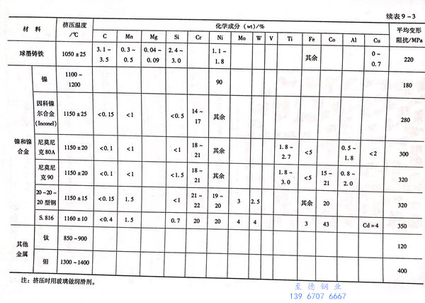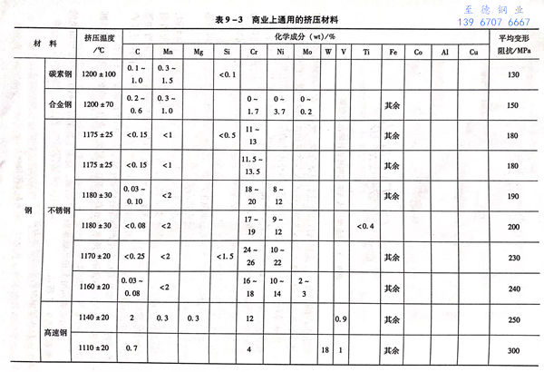 普通碳素鋼和低合金鋼的變形阻抗較小,在目前的鋼管生產總量中占有很大的比重,在大量生產時,選用軋管機最為有利,只是在生產不能軋制的斷面以及小批量生產的情況下,選擇擠壓法才比較經濟合理。而,在一些特殊的產品領域內,如高合金鋼、鐵素體高鉻鋼、奧氏體不銹鋼和各種耐蝕鋼、耐熱鋼以及高速工具鋼等材料的生產中,由于變形原理和經濟性的原因,擠壓法幾乎完全排擠了軋管法,成為首選。除此之外,在軋鋼機上不能生產或難以生產的尼莫尼克合金,哈斯特洛伊鎳合金,因科鎳爾合金,克倫奈爾鎳合金,蒙奈爾合金,因科洛依合金,齊爾康鋯合金和鎳、鈦、鉬等材料也可以采用擠壓法生產管材和型材。商業上通用的擠壓材料見表9-3。