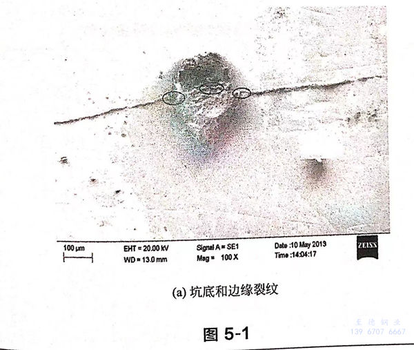 把圖5-1(c)放大,發現點(dian)蝕坑(keng)底部存(cun)在很多(duo)長度為(wei)6~8μm的(de)微(wei)裂(lie)(lie)(lie)紋(wen)(wen)(wen),這(zhe)些微(wei)裂(lie)(lie)(lie)紋(wen)(wen)(wen)都垂直于拉伸方向,如(ru)圖5-11所示(shi)。產(chan)生(sheng)多(duo)條(tiao)裂(lie)(lie)(lie)紋(wen)(wen)(wen)的(de)原(yuan)因是(shi):點(dian)蝕坑(keng)底部較平坦,應力集中程度幾乎(hu)相同,只(zhi)要在比較薄弱(ruo)的(de)位(wei)置就產(chan)生(sheng)位(wei)錯滑移,進而產(chan)生(sheng)微(wei)裂(lie)(lie)(lie)紋(wen)(wen)(wen)。最終,同一(yi)面的(de)微(wei)裂(lie)(lie)(lie)紋(wen)(wen)(wen)匯(hui)聚成(cheng)一(yi)條(tiao)裂(lie)(lie)(lie)紋(wen)(wen)(wen),成(cheng)為(wei)主裂(lie)(lie)(lie)紋(wen)(wen)(wen)的(de)起源。