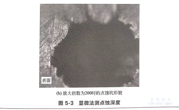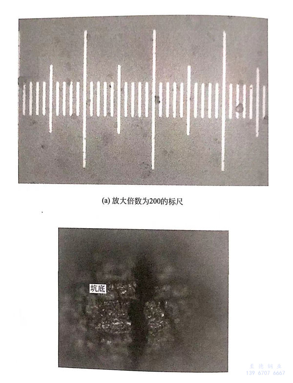 裂紋(wen)萌(meng)生(sheng)受(shou)力學(xue)作(zuo)用(yong)(yong)和電化學(xue)作(zuo)用(yong)(yong)共同作(zuo)用(yong)(yong),而力學(xue)作(zuo)用(yong)(yong)占重要地位。因此,由點(dian)蝕(shi)坑(keng)(keng)引起的局部應力集(ji)中在(zai)很大程度(du)(du)上決定(ding)了(le)裂紋(wen)萌(meng)生(sheng)位置(zhi)。為了(le)明確點(dian)蝕(shi)坑(keng)(keng)形貌與裂紋(wen)萌(meng)生(sheng)的關(guan)系,對點(dian)蝕(shi)坑(keng)(keng)尺寸進行(xing)了(le)測(ce)量。點(dian)蝕(shi)坑(keng)(keng)深度(du)(du)采(cai)用(yong)(yong)顯微法測(ce)量,放大倍(bei)數為200時(shi)的標尺如圖(tu)5-3(a)所(suo)(suo)示(shi),觀察(cha)到的點(dian)蝕(shi)坑(keng)(keng)底部和表面的圖(tu)像(xiang)如圖(tu)5-3(b)所(suo)(suo)示(shi)。