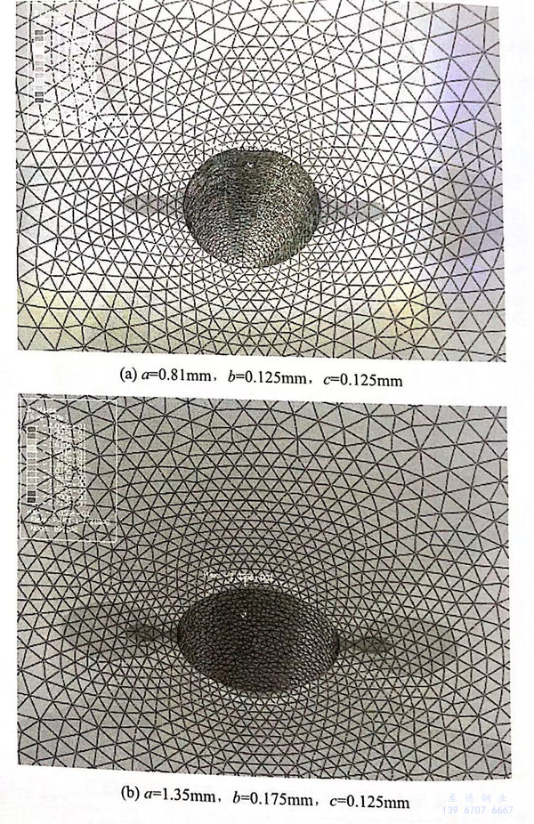 根據測得的(de)點蝕(shi)坑(keng)(keng)尺寸(cun),采(cai)用ABAQUS軟件對(dui)不同形(xing)貌點蝕(shi)坑(keng)(keng)建立三維模(mo)型(xing)(xing),分(fen)(fen)析點蝕(shi)坑(keng)(keng)內應(ying)力集中情況。點蝕(shi)坑(keng)(keng)形(xing)貌簡化為(wei)半橢球(qiu)形(xing):b為(wei)蝕(shi)坑(keng)(keng)半長(chang),沿拉伸方(fang)向;c為(wei)蝕(shi)坑(keng)(keng)半寬(kuan),垂直于拉伸方(fang)向;a為(wei)蝕(shi)坑(keng)(keng)深(shen)度。幾何模(mo)型(xing)(xing)和有(you)限元網格模(mo)型(xing)(xing)如圖5-4所示,模(mo)型(xing)(xing)中部分(fen)(fen)點蝕(shi)坑(keng)(keng)尺寸(cun)來源于應(ying)力腐蝕(shi)試驗后試樣中點蝕(shi)坑(keng)(keng)的(de)實際(ji)尺寸(cun)。材料(liao)模(mo)型(xing)(xing)采(cai)用彈塑性模(mo)型(xing)(xing),彈性模(mo)量(liang)E=210GPa,泊松比v=0.3.XY面施加Z方(fang)向的(de)約束(shu),即UY=0,XZ面采(cai)用對(dui)稱邊界。