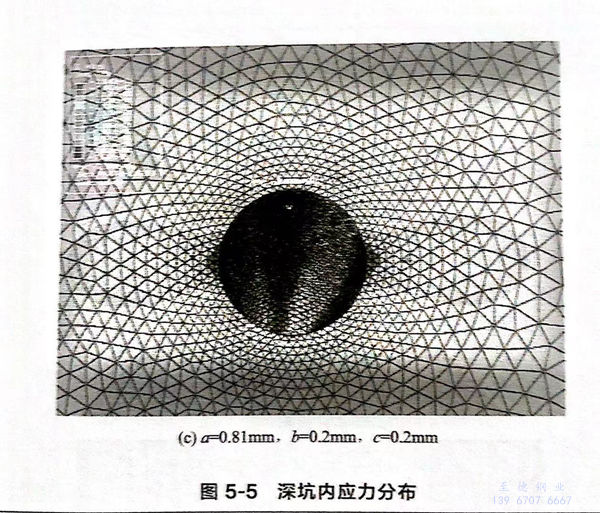 由圖(tu)5-10可見,坑內最(zui)大應力(li)出現(xian)在次級點蝕坑的(de)(de)坑口(kou)(kou)處,應力(li)集(ji)(ji)中(zhong)系數為3.2,坑底的(de)(de)應力(li)為外加應力(li)的(de)(de)2.5倍;與圖(tu)5-6(b)相比,原點蝕坑坑肩和(he)坑口(kou)(kou)位置的(de)(de)應力(li)集(ji)(ji)中(zhong)程度基本沒變。