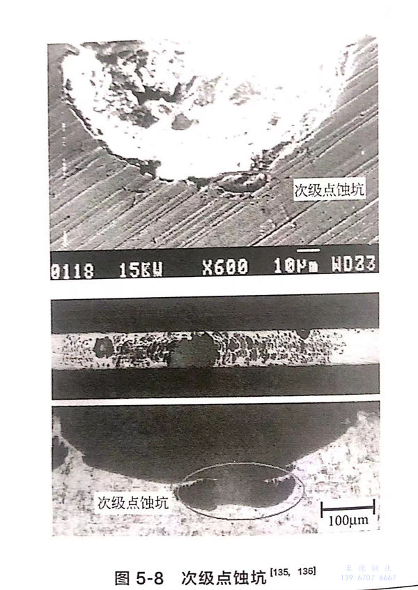 從電化學角度來說,由于金屬離子的水解,點蝕坑底的pH值更低、Cl-濃度更大,裂紋會優先在坑底萌生。但實際中發現,多數應力腐蝕裂紋在坑肩或坑口邊緣處萌生,無論在高應力還是低應力情況下,都發現了這種現象。圖5-1是慢拉伸試驗后掃描電鏡下觀察到的試樣表面點蝕坑和裂紋,從圖中可看出,點蝕形貌近似為半橢球形,在高應力作用下,沿拉伸方向的表面尺寸大于垂直于拉伸方向的表面尺寸。實際應力腐蝕開裂案例中,觀察到的點蝕坑和裂紋萌生位置及形貌如圖5-2所示。