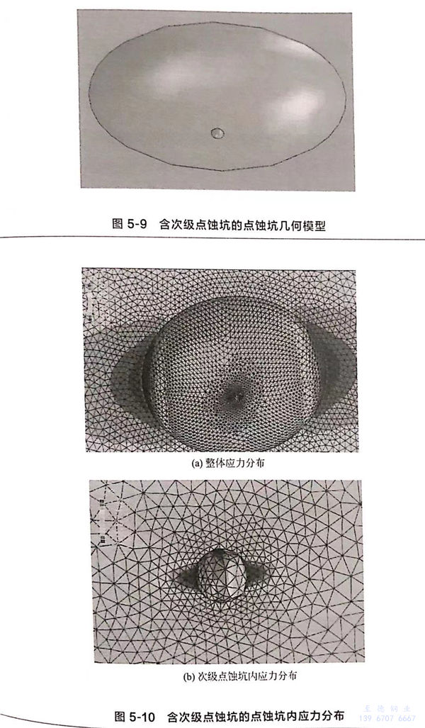 不(bu)(bu)論是深坑(keng)(keng)(keng)還是淺(qian)坑(keng)(keng)(keng),點(dian)(dian)(dian)(dian)蝕(shi)(shi)(shi)坑(keng)(keng)(keng)口(kou)或下(xia)邊緣的應(ying)力(li)集中(zhong)(zhong)(zhong)程度最(zui)大,大部分(fen)裂紋(wen)(wen)會(hui)優先(xian)在(zai)此萌(meng)生,這與在(zai)試驗和(he)實際(ji)(ji)失效案例中(zhong)(zhong)(zhong)觀(guan)察到的現(xian)象是一致的。然(ran)而,也發(fa)現(xian)了(le)一些起(qi)源于坑(keng)(keng)(keng)底的裂紋(wen)(wen),這主(zhu)要有兩方面(mian)的原(yuan)因:一是淺(qian)蝕(shi)(shi)(shi)坑(keng)(keng)(keng)坑(keng)(keng)(keng)口(kou)、坑(keng)(keng)(keng)肩和(he)坑(keng)(keng)(keng)底的應(ying)力(li)集中(zhong)(zhong)(zhong)程度相差很小(xiao),微小(xiao)的力(li)學(xue)變(bian)(bian)化(hua)和(he)電化(hua)學(xue)溶(rong)解變(bian)(bian)化(hua)都可能引起(qi)裂紋(wen)(wen)萌(meng)生位置(zhi)的改變(bian)(bian);二是實際(ji)(ji)點(dian)(dian)(dian)(dian)蝕(shi)(shi)(shi)的形貌并不(bu)(bu)是標(biao)準(zhun)的半橢球形,受材(cai)料內(nei)部夾雜及晶(jing)體結構的影響,點(dian)(dian)(dian)(dian)蝕(shi)(shi)(shi)坑(keng)(keng)(keng)內(nei)部可能產生次(ci)級(ji)(ji)點(dian)(dian)(dian)(dian)蝕(shi)(shi)(shi)坑(keng)(keng)(keng),如(ru)(ru)圖5-8所(suo)示(shi),次(ci)級(ji)(ji)點(dian)(dian)(dian)(dian)蝕(shi)(shi)(shi)坑(keng)(keng)(keng)的存在(zai)引起(qi)最(zui)大應(ying)力(li)集中(zhong)(zhong)(zhong)位置(zhi)的改變(bian)(bian)。為了(le)研究次(ci)級(ji)(ji)點(dian)(dian)(dian)(dian)蝕(shi)(shi)(shi)坑(keng)(keng)(keng)對應(ying)力(li)集中(zhong)(zhong)(zhong)的影響,在(zai)初級(ji)(ji)點(dian)(dian)(dian)(dian)蝕(shi)(shi)(shi)坑(keng)(keng)(keng)的基礎上建立次(ci)級(ji)(ji)點(dian)(dian)(dian)(dian)蝕(shi)(shi)(shi)坑(keng)(keng)(keng)模(mo)型,并進(jin)行(xing)有限元(yuan)模(mo)擬。點(dian)(dian)(dian)(dian)蝕(shi)(shi)(shi)坑(keng)(keng)(keng)尺寸(cun):a=0.075mm,b=0.2mm,c=0.15mm;次(ci)級(ji)(ji)坑(keng)(keng)(keng)的尺寸(cun):a=b=c=0.01mm,幾何(he)模(mo)型如(ru)(ru)圖5-9所(suo)示(shi),施加10MPa的單向拉力(li),模(mo)擬結果如(ru)(ru)圖5-10所(suo)示(shi)。