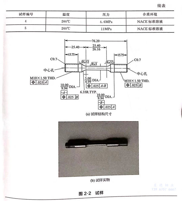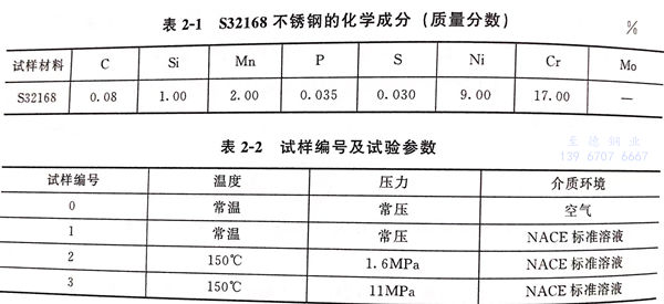 以S32168不(bu)銹鋼為試驗材料,材料的化學成分列于表2-1。試樣加工成標距為25.4mm、直徑為5.00mm的圓柱狀,試樣幾何形狀如圖2-2(a)所示,實物如圖2-2(b)所示。試驗之前,試樣先用400#、200#、2000#三種不同規格的砂紙依次沿著縱向和橫向交替打磨。打磨完成后,將試樣依次放入乙醇和丙酮溶液中進行超聲清洗,用去離子水沖洗并且吹干。試驗溶液用NACE標準中規定的分析純氯化鈉、乙酸和去離子水配制,其中氯化鈉的質量分數為5%,乙酸的質量分數為0.5%,溶液的pH值在3~4之間,試樣編號及試驗參數見表2-2.試驗是在美國CORT-EST公司研制的慢應變速率應力腐蝕試驗機上進行的,拉伸速率為1.9×10-6s-1.每次試驗結束,都會得到一條應力-應變曲線和斷裂時間,隨之可以得到最大應力、斷面收縮率和伸長率。將拉斷的試樣先后用去離子水和乙醇清洗并吹干,用掃描電鏡(SEM)觀察斷口形貌,然后將樣品沿標距段縱剖,觀察裂紋路徑及深度方向的生長情況。