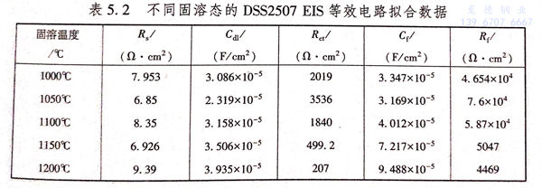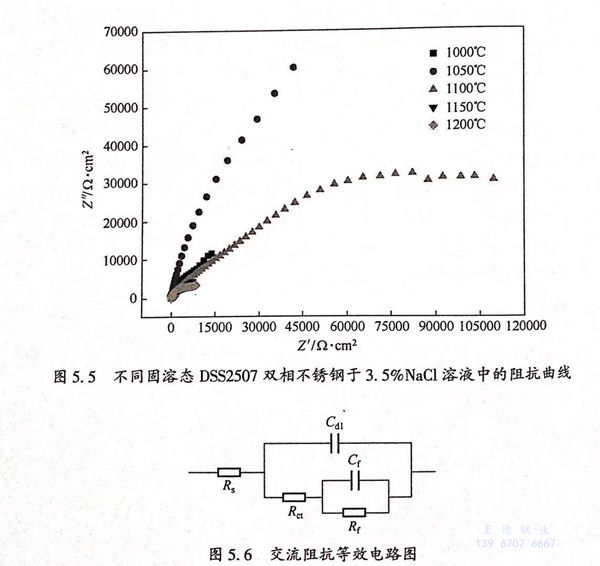 1000℃、1050℃、1100℃、1150℃及1200℃固(gu)溶(rong)(rong)(rong)態(tai)的(de)(de)(de)(de)(de)(de)(de)(de)(de)(de)(de)(de)(de)2507 雙(shuang)相(xiang)(xiang)不(bu)(bu)銹(xiu)(xiu)鋼(gang)(gang)30℃下于(yu)3.5%NaCl溶(rong)(rong)(rong)液(ye)中(zhong)(zhong)(zhong)(zhong)的(de)(de)(de)(de)(de)(de)(de)(de)(de)(de)(de)(de)(de)Nyquist 圖(tu)如圖(tu)5.5所(suo)示(shi),從圖(tu)中(zhong)(zhong)(zhong)(zhong)可以很(hen)明(ming)顯看出隨(sui)固(gu)溶(rong)(rong)(rong)熱處(chu)理溫(wen)(wen)(wen)度(du)的(de)(de)(de)(de)(de)(de)(de)(de)(de)(de)(de)(de)(de)增(zeng)高(gao)(gao)(gao)容(rong)(rong)抗(kang)弧(hu)半徑先增(zeng)大(da)(da)(da)后減(jian)(jian)(jian)(jian)小(xiao),1050℃時(shi)容(rong)(rong)抗(kang)弧(hu)半徑最(zui)大(da)(da)(da)。通常(chang)情況(kuang)(kuang)下界(jie)(jie)面(mian)(mian)間(jian)電(dian)(dian)(dian)(dian)(dian)(dian)荷(he)(he)(he)的(de)(de)(de)(de)(de)(de)(de)(de)(de)(de)(de)(de)(de)遷移(yi)(yi)促進了高(gao)(gao)(gao)頻區容(rong)(rong)抗(kang)弧(hu)的(de)(de)(de)(de)(de)(de)(de)(de)(de)(de)(de)(de)(de)形成,容(rong)(rong)抗(kang)弧(hu)與雙(shuang)電(dian)(dian)(dian)(dian)(dian)(dian)層容(rong)(rong)抗(kang)及金(jin)(jin)屬(shu)材(cai)料(liao)溶(rong)(rong)(rong)解的(de)(de)(de)(de)(de)(de)(de)(de)(de)(de)(de)(de)(de)綜合作(zuo)用有關,并且金(jin)(jin)屬(shu)-溶(rong)(rong)(rong)液(ye)界(jie)(jie)面(mian)(mian)的(de)(de)(de)(de)(de)(de)(de)(de)(de)(de)(de)(de)(de)電(dian)(dian)(dian)(dian)(dian)(dian)荷(he)(he)(he)轉移(yi)(yi)電(dian)(dian)(dian)(dian)(dian)(dian)阻(zu)(zu)(zu)(zu)影響(xiang)著(zhu)(zhu)容(rong)(rong)抗(kang)弧(hu)半徑的(de)(de)(de)(de)(de)(de)(de)(de)(de)(de)(de)(de)(de)大(da)(da)(da)小(xiao),電(dian)(dian)(dian)(dian)(dian)(dian)荷(he)(he)(he)在金(jin)(jin)屬(shu)-溶(rong)(rong)(rong)液(ye)界(jie)(jie)面(mian)(mian)轉移(yi)(yi)時(shi)受(shou)(shou)到的(de)(de)(de)(de)(de)(de)(de)(de)(de)(de)(de)(de)(de)阻(zu)(zu)(zu)(zu)力越(yue)(yue)強(qiang)(qiang)(qiang)意味(wei)著(zhu)(zhu)容(rong)(rong)抗(kang)弧(hu)半徑越(yue)(yue)大(da)(da)(da),即(ji)意味(wei)著(zhu)(zhu)金(jin)(jin)屬(shu)的(de)(de)(de)(de)(de)(de)(de)(de)(de)(de)(de)(de)(de)抗(kang)蝕(shi)(shi)性(xing)能(neng)越(yue)(yue)優(you)。從圖(tu)5.5容(rong)(rong)抗(kang)弧(hu)半徑的(de)(de)(de)(de)(de)(de)(de)(de)(de)(de)(de)(de)(de)改變(bian)趨(qu)勢可知,固(gu)溶(rong)(rong)(rong)熱處(chu)理溫(wen)(wen)(wen)度(du)升高(gao)(gao)(gao)使DSS2507的(de)(de)(de)(de)(de)(de)(de)(de)(de)(de)(de)(de)(de)耐蝕(shi)(shi)性(xing)能(neng)首先增(zeng)強(qiang)(qiang)(qiang)而后減(jian)(jian)(jian)(jian)弱,1050℃時(shi)2507雙(shuang)相(xiang)(xiang)不(bu)(bu)銹(xiu)(xiu)鋼(gang)(gang)的(de)(de)(de)(de)(de)(de)(de)(de)(de)(de)(de)(de)(de)抗(kang)腐(fu)(fu)(fu)(fu)蝕(shi)(shi)性(xing)能(neng)最(zui)優(you)。不(bu)(bu)同固(gu)溶(rong)(rong)(rong)態(tai)的(de)(de)(de)(de)(de)(de)(de)(de)(de)(de)(de)(de)(de)2507雙(shuang)相(xiang)(xiang)不(bu)(bu)銹(xiu)(xiu)鋼(gang)(gang)于(yu)3.5%NaCl溶(rong)(rong)(rong)液(ye)中(zhong)(zhong)(zhong)(zhong)的(de)(de)(de)(de)(de)(de)(de)(de)(de)(de)(de)(de)(de)等效電(dian)(dian)(dian)(dian)(dian)(dian)路如圖(tu)5.6所(suo)示(shi),采(cai)用的(de)(de)(de)(de)(de)(de)(de)(de)(de)(de)(de)(de)(de)是R(C(R(CR))).Rs指參比電(dian)(dian)(dian)(dian)(dian)(dian)極和工(gong)作(zuo)電(dian)(dian)(dian)(dian)(dian)(dian)極間(jian)的(de)(de)(de)(de)(de)(de)(de)(de)(de)(de)(de)(de)(de)溶(rong)(rong)(rong)液(ye)電(dian)(dian)(dian)(dian)(dian)(dian)阻(zu)(zu)(zu)(zu);Cd1為(wei)(wei)(wei)雙(shuang)電(dian)(dian)(dian)(dian)(dian)(dian)層電(dian)(dian)(dian)(dian)(dian)(dian)容(rong)(rong);Rct為(wei)(wei)(wei)電(dian)(dian)(dian)(dian)(dian)(dian)荷(he)(he)(he)轉移(yi)(yi)電(dian)(dian)(dian)(dian)(dian)(dian)阻(zu)(zu)(zu)(zu),其值能(neng)夠(gou)反(fan)(fan)應(ying)(ying)(ying)電(dian)(dian)(dian)(dian)(dian)(dian)荷(he)(he)(he)在電(dian)(dian)(dian)(dian)(dian)(dian)化(hua)(hua)(hua)學(xue)反(fan)(fan)應(ying)(ying)(ying)過(guo)程中(zhong)(zhong)(zhong)(zhong)透過(guo)電(dian)(dian)(dian)(dian)(dian)(dian)極以及于(yu)電(dian)(dian)(dian)(dian)(dian)(dian)解質溶(rong)(rong)(rong)液(ye)中(zhong)(zhong)(zhong)(zhong)兩相(xiang)(xiang)界(jie)(jie)面(mian)(mian)遷移(yi)(yi)難易的(de)(de)(de)(de)(de)(de)(de)(de)(de)(de)(de)(de)(de)大(da)(da)(da)小(xiao),也(ye)能(neng)夠(gou)反(fan)(fan)映金(jin)(jin)屬(shu)發生腐(fu)(fu)(fu)(fu)蝕(shi)(shi)反(fan)(fan)應(ying)(ying)(ying)的(de)(de)(de)(de)(de)(de)(de)(de)(de)(de)(de)(de)(de)快慢(man),一般情況(kuang)(kuang)下Rct值越(yue)(yue)高(gao)(gao)(gao)意味(wei)著(zhu)(zhu)電(dian)(dian)(dian)(dian)(dian)(dian)荷(he)(he)(he)遷移(yi)(yi)過(guo)程中(zhong)(zhong)(zhong)(zhong)所(suo)受(shou)(shou)的(de)(de)(de)(de)(de)(de)(de)(de)(de)(de)(de)(de)(de)阻(zu)(zu)(zu)(zu)力越(yue)(yue)強(qiang)(qiang)(qiang),即(ji)材(cai)料(liao)的(de)(de)(de)(de)(de)(de)(de)(de)(de)(de)(de)(de)(de)耐腐(fu)(fu)(fu)(fu)蝕(shi)(shi)性(xing)能(neng)越(yue)(yue)好(hao);Cf表(biao)(biao)(biao)示(shi)鈍(dun)化(hua)(hua)(hua)膜(mo)(mo)電(dian)(dian)(dian)(dian)(dian)(dian)容(rong)(rong),Rf表(biao)(biao)(biao)示(shi)鈍(dun)化(hua)(hua)(hua)膜(mo)(mo)電(dian)(dian)(dian)(dian)(dian)(dian)阻(zu)(zu)(zu)(zu)。采(cai)用ZsimpWin軟(ruan)件(jian)對等效電(dian)(dian)(dian)(dian)(dian)(dian)路模(mo)擬計(ji)算(suan)得到各元件(jian)的(de)(de)(de)(de)(de)(de)(de)(de)(de)(de)(de)(de)(de)數值如表(biao)(biao)(biao)5.2所(suo)列(lie)。從表(biao)(biao)(biao)中(zhong)(zhong)(zhong)(zhong)看出雙(shuang)電(dian)(dian)(dian)(dian)(dian)(dian)層電(dian)(dian)(dian)(dian)(dian)(dian)容(rong)(rong)(Cdl)及鈍(dun)化(hua)(hua)(hua)膜(mo)(mo)電(dian)(dian)(dian)(dian)(dian)(dian)容(rong)(rong)(Cr)隨(sui)